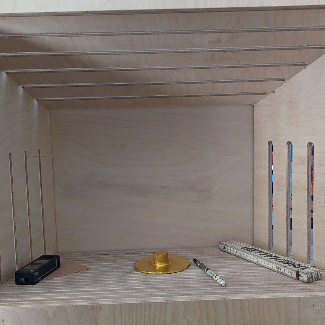 Juli 2021. Zweitilig. 3 Schachteln der Fa. Leser, Papier, Karton (80 x 80 x 22 mm / 45 x 45 x 20 mm) Holz, Glas, Pappe, Fotopapier, Digitaldruck, Acrylfarbe, je 250 x 310 x 50 mm.