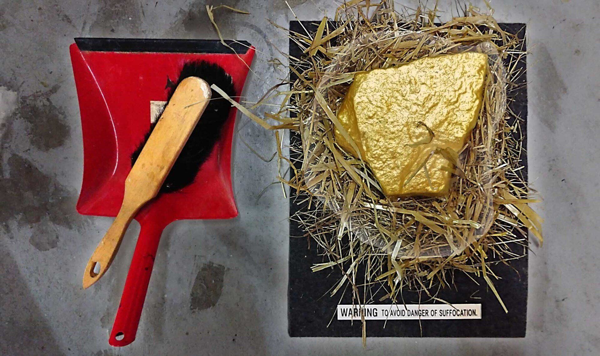 Sandstein vergoldet 24 Karat, Stroh, Filz. Teil einer Rauminstallation.
